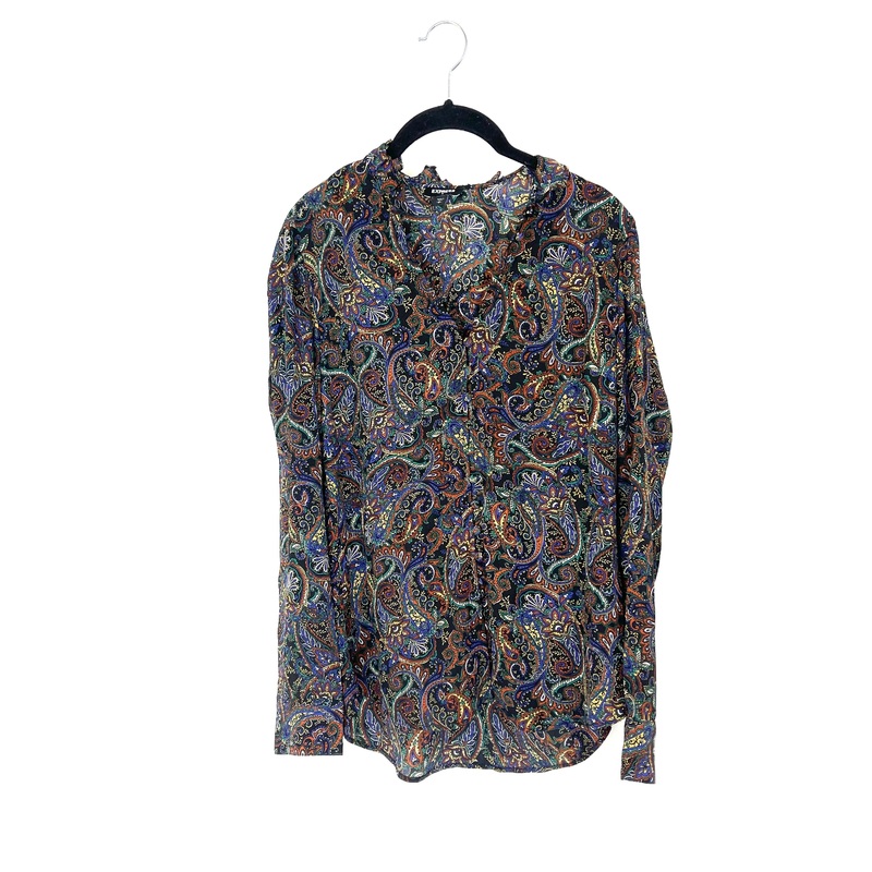 Brand new- donated by the designerExpress lightweight, multicolor, paisley printed blouse, long sleeves, ruffled trim around the back of the neck hemline, convertible neckline from high rounded neckline to v-neckline with buttons going down the front, high