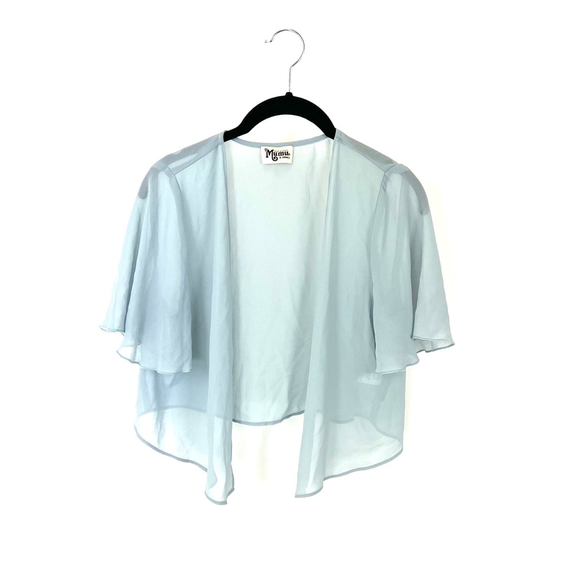 Brand new - donated from the designerShow Me Your Mumu muted blue sheer open cropped shawl with lettuce hem short sleeves.Size extra small (size 0-2)100% polyesterEstimated Original Retail Price: $88*This is a sample piece donated from Show Me Your Mumu to